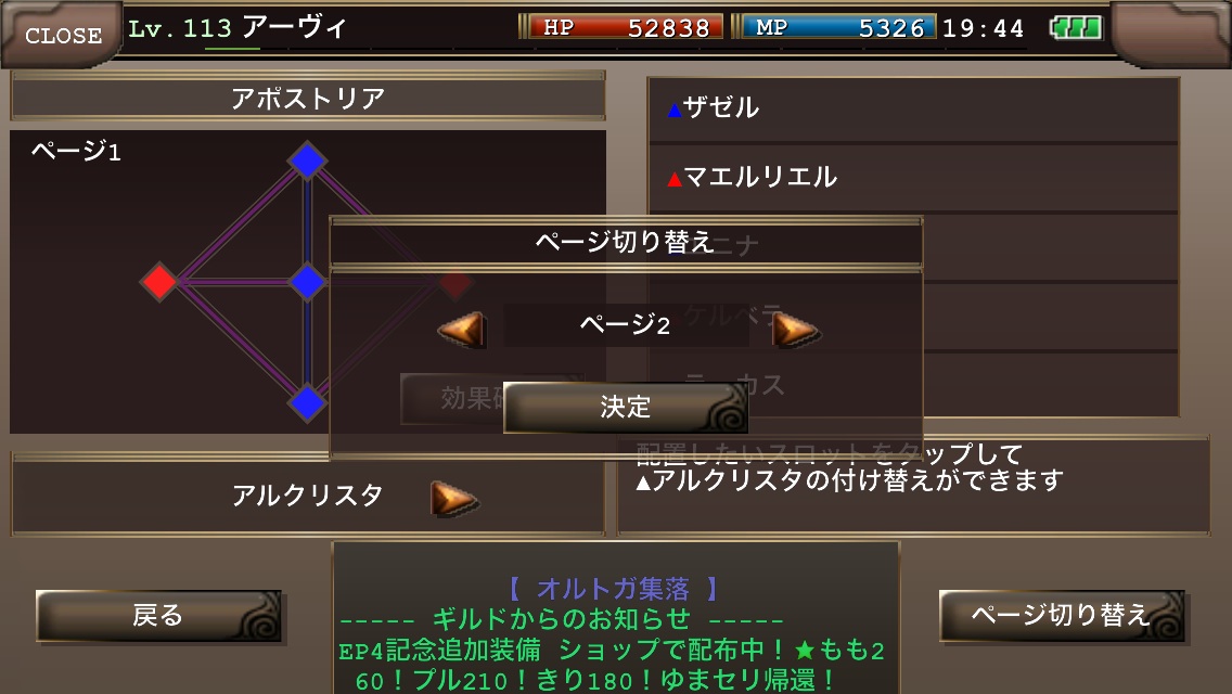 ⑴通常の「ステータス」画面から「アポストリア」を選択しページを送ると、